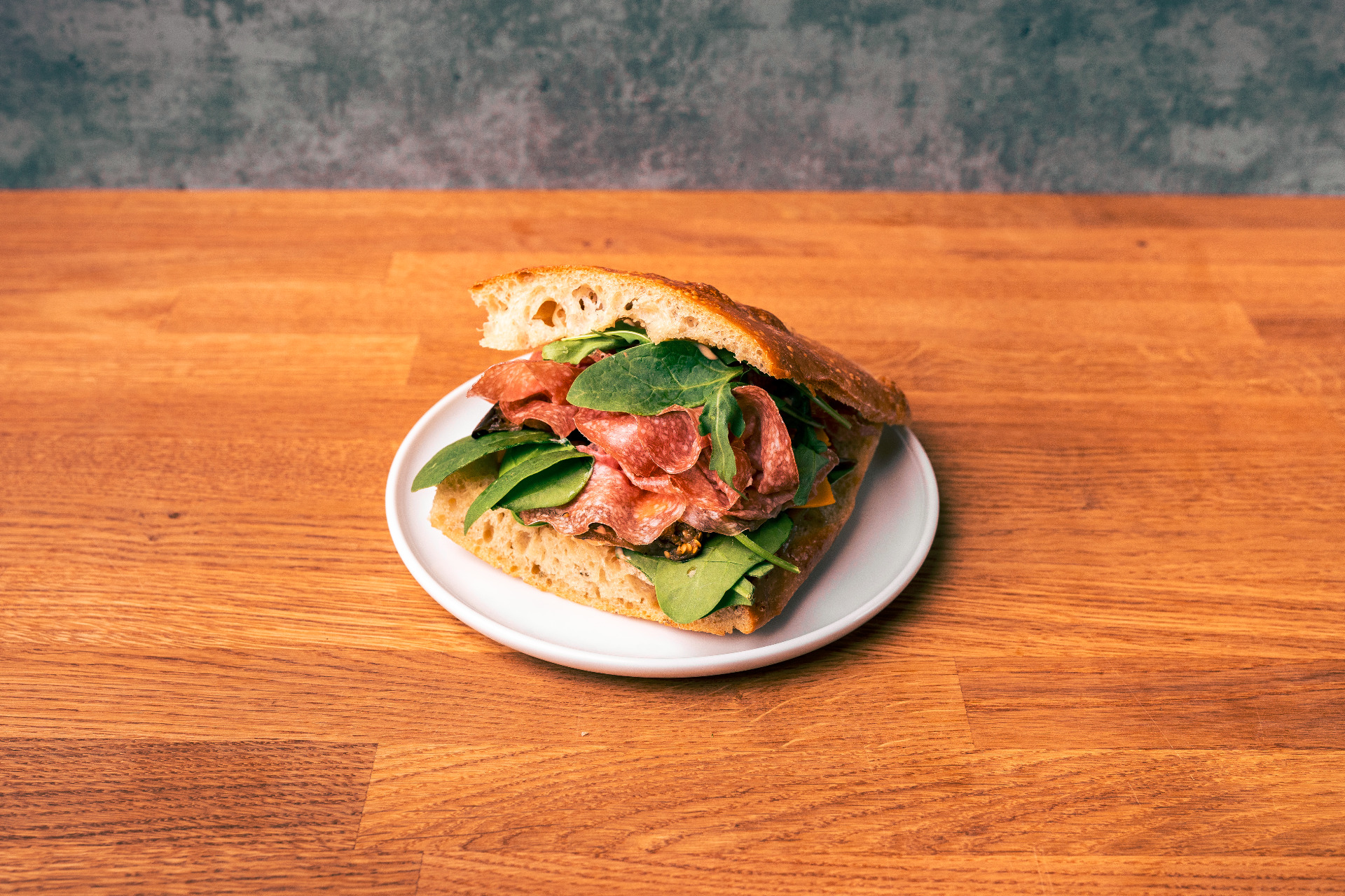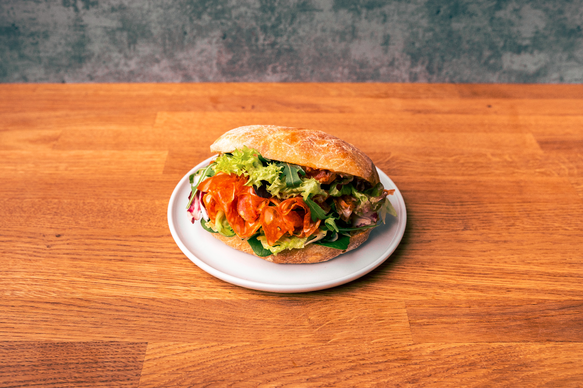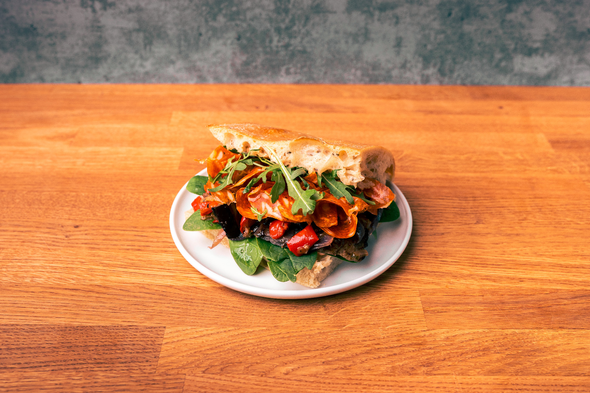 Włoskie pikantne salami, warzywa grillowane, majonez pomidorowy, rukola