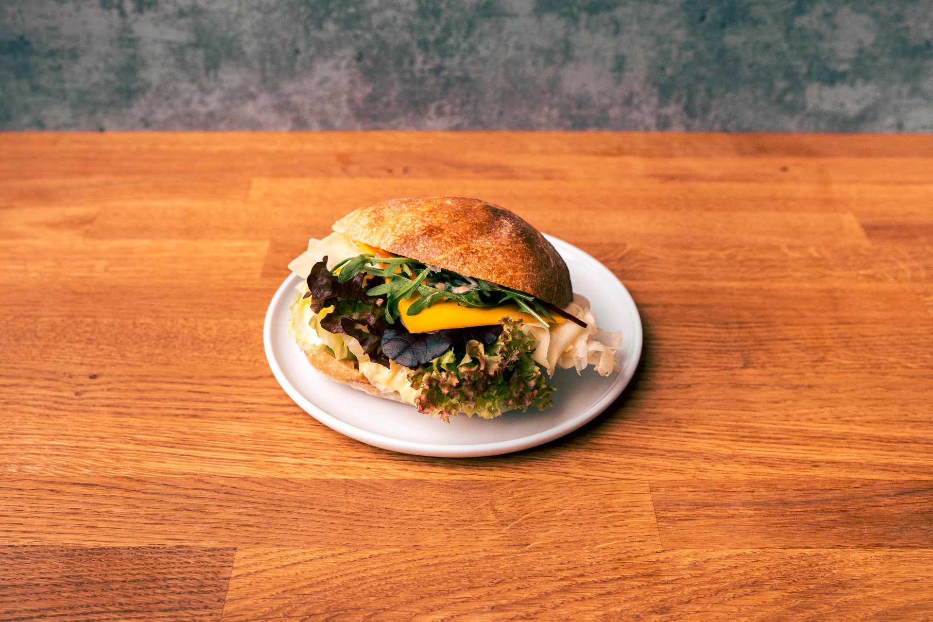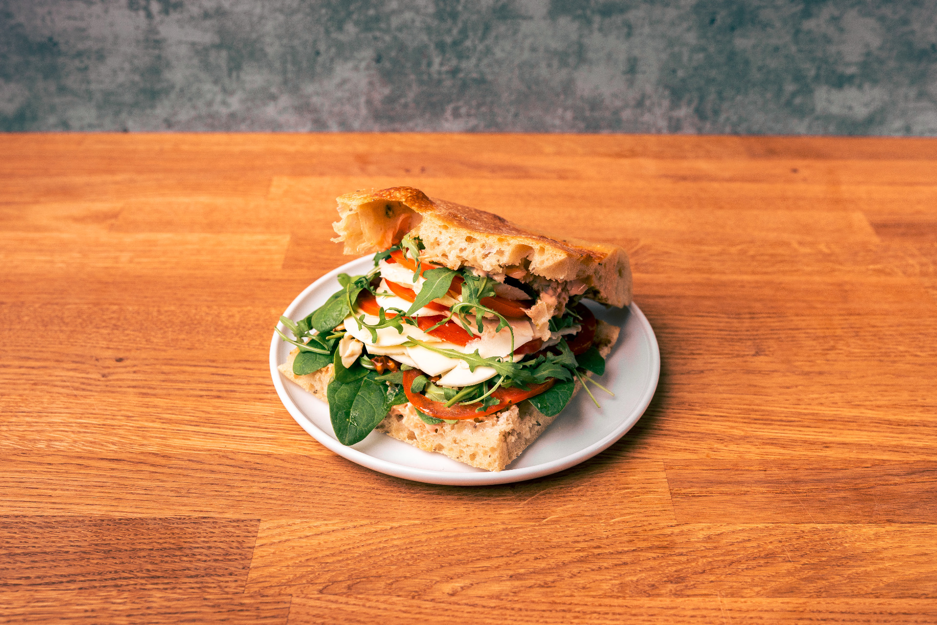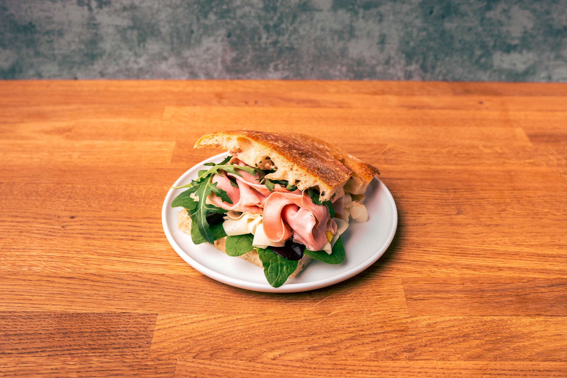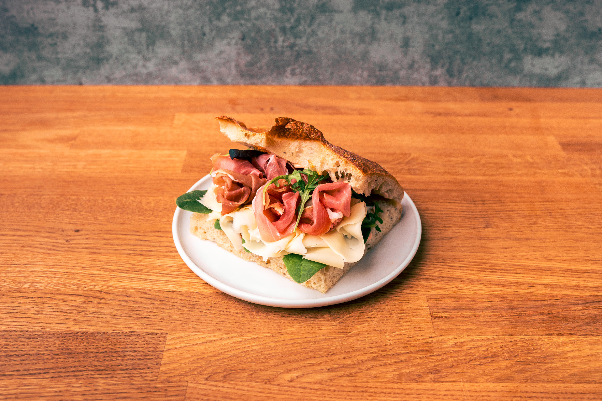 Włoska szynka dojrzewająca, ser dojrzewający, rukola, majonez z wędzonych warzyw