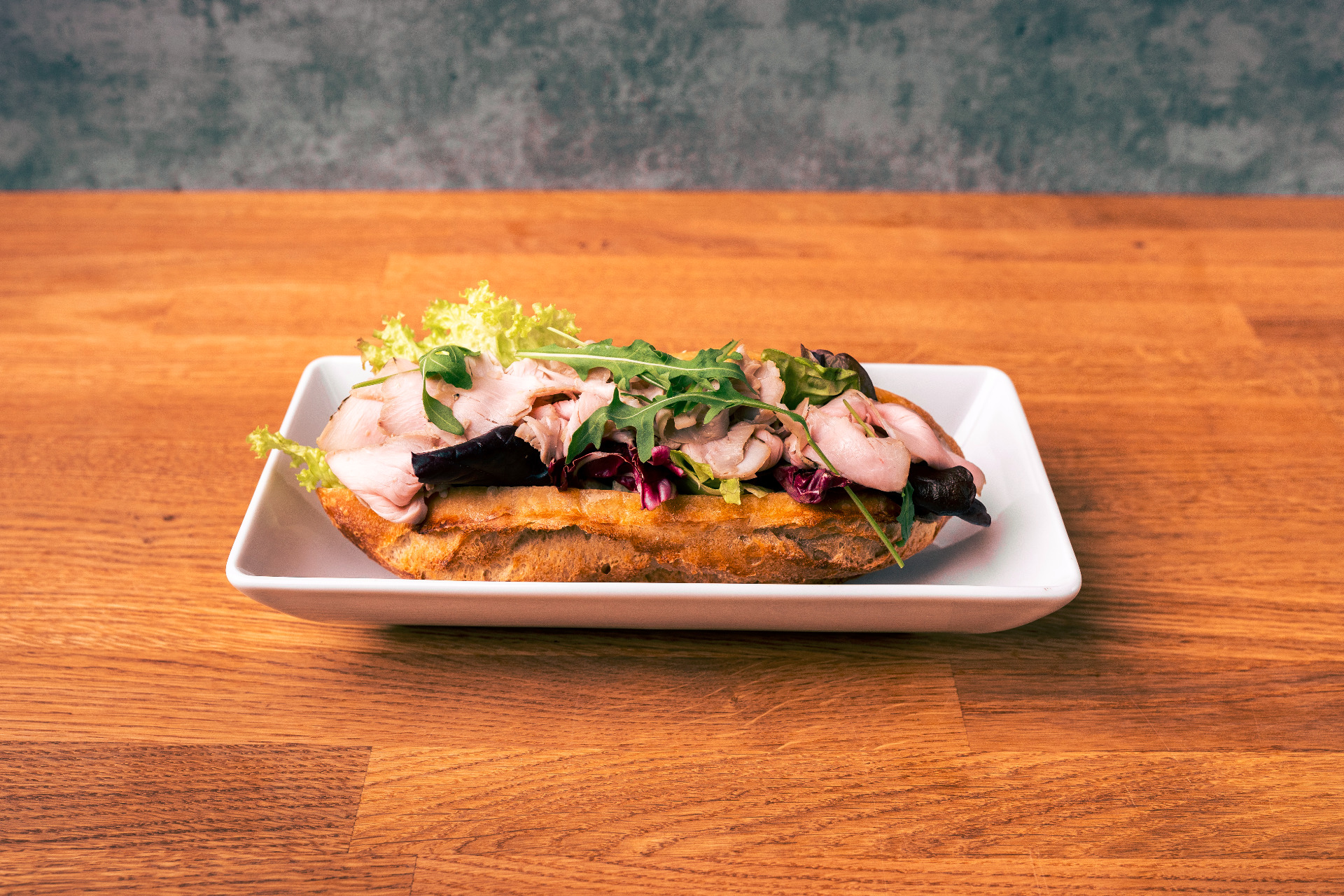 Włoska mortadella z pistacjami, sałata, majonez porowy, rukola