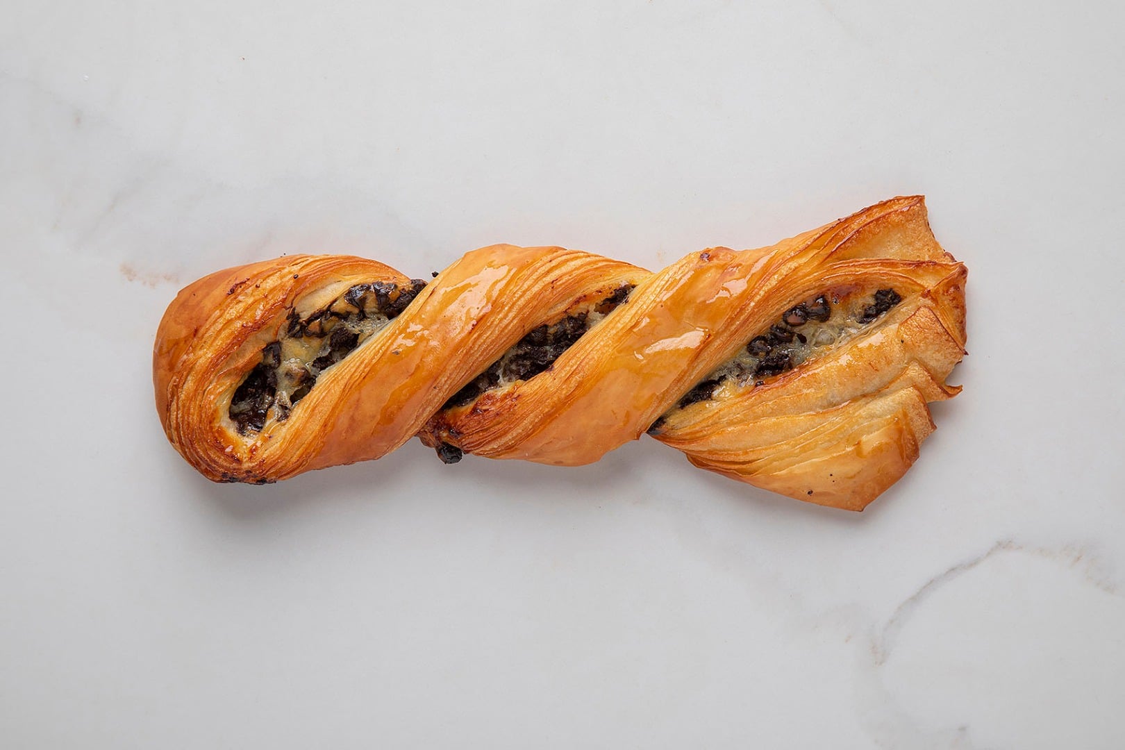Mąka pszenna Label Rouge, płynny zakwas pszenny, masło gostyńskie, krem pâtissière, czekolada Valrhona.