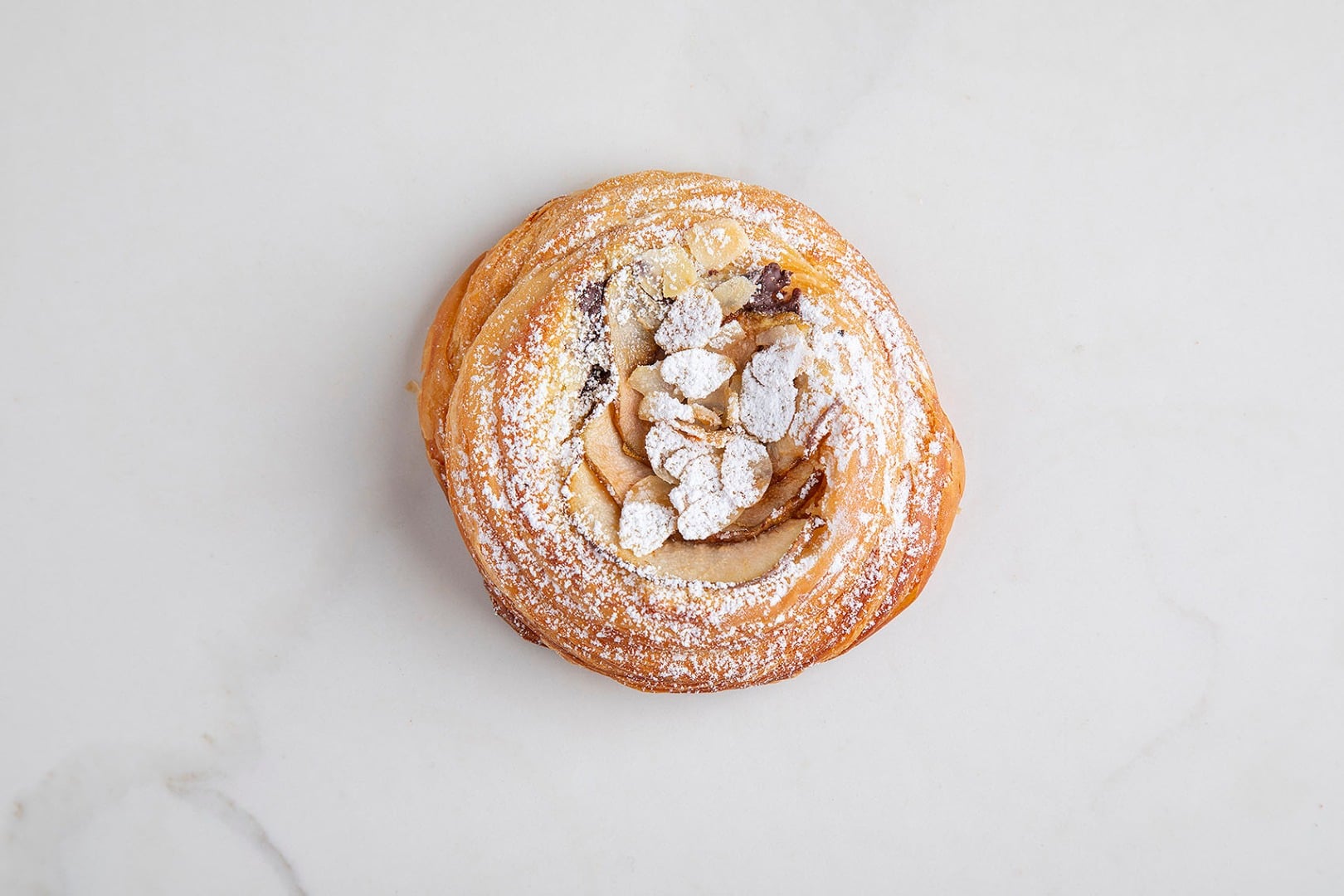 Mąka pszenna Label Rouge, płynny zakwas pszenny, masło gostyńskie, krem migdałowy, świeży owoc.